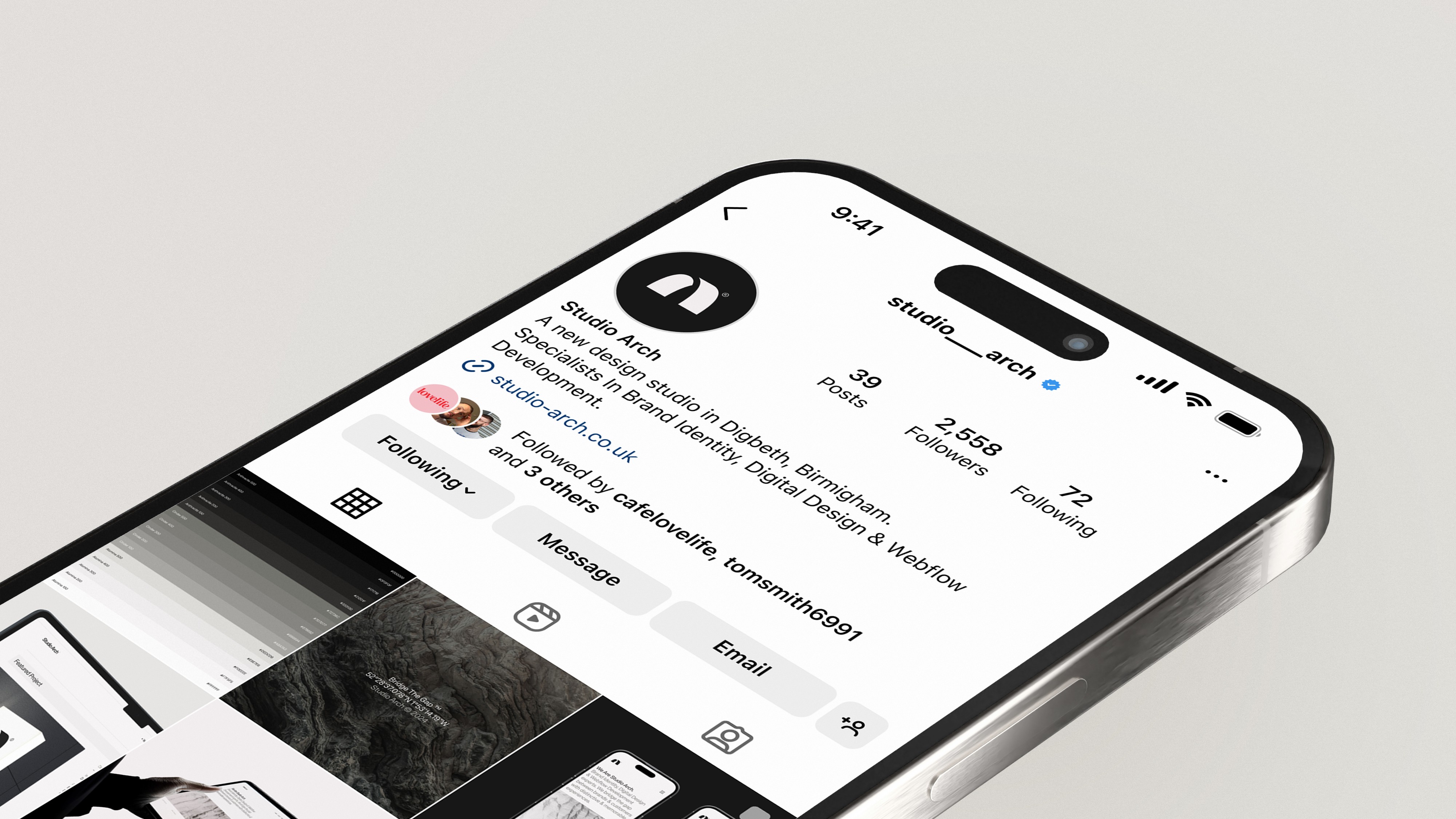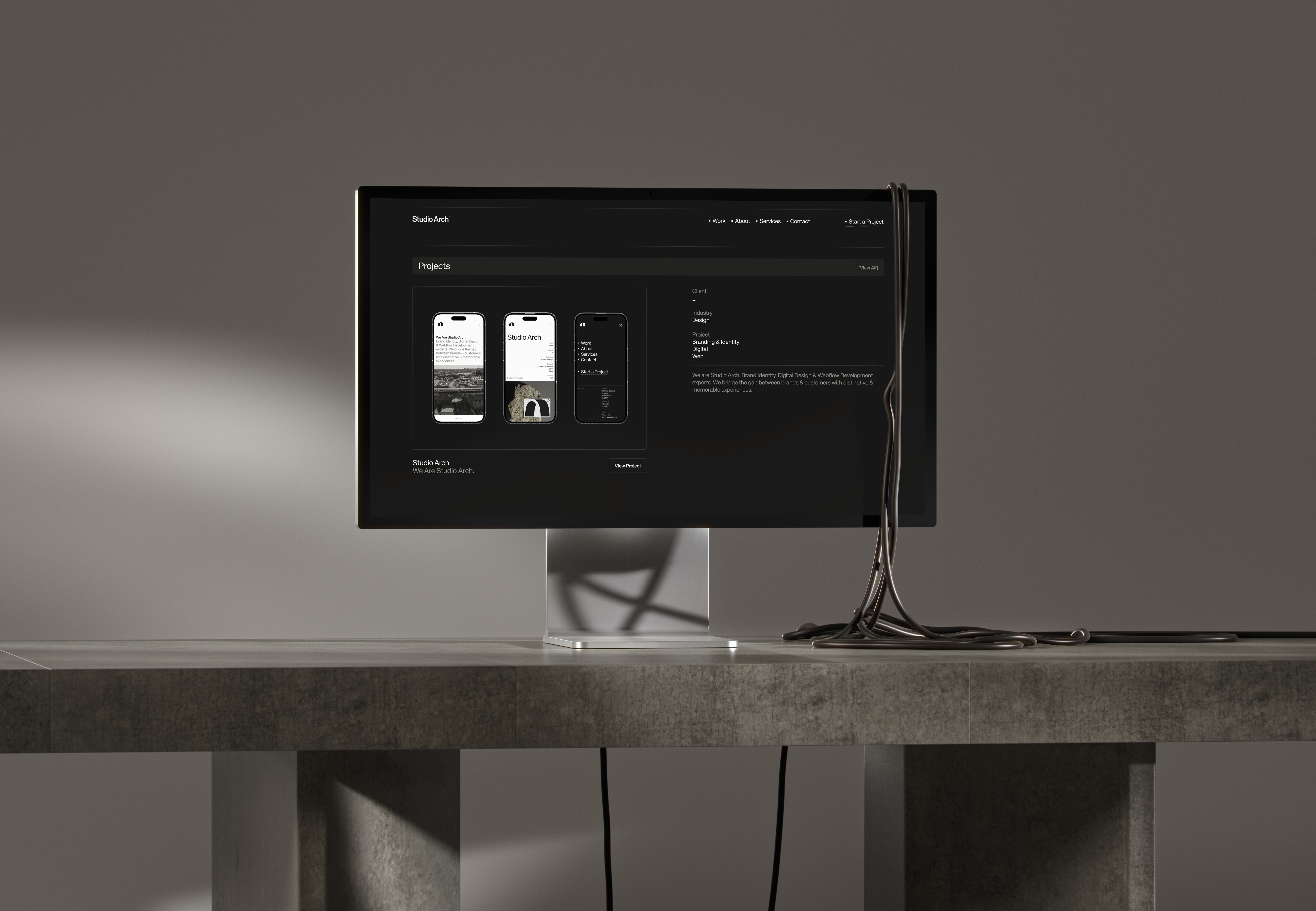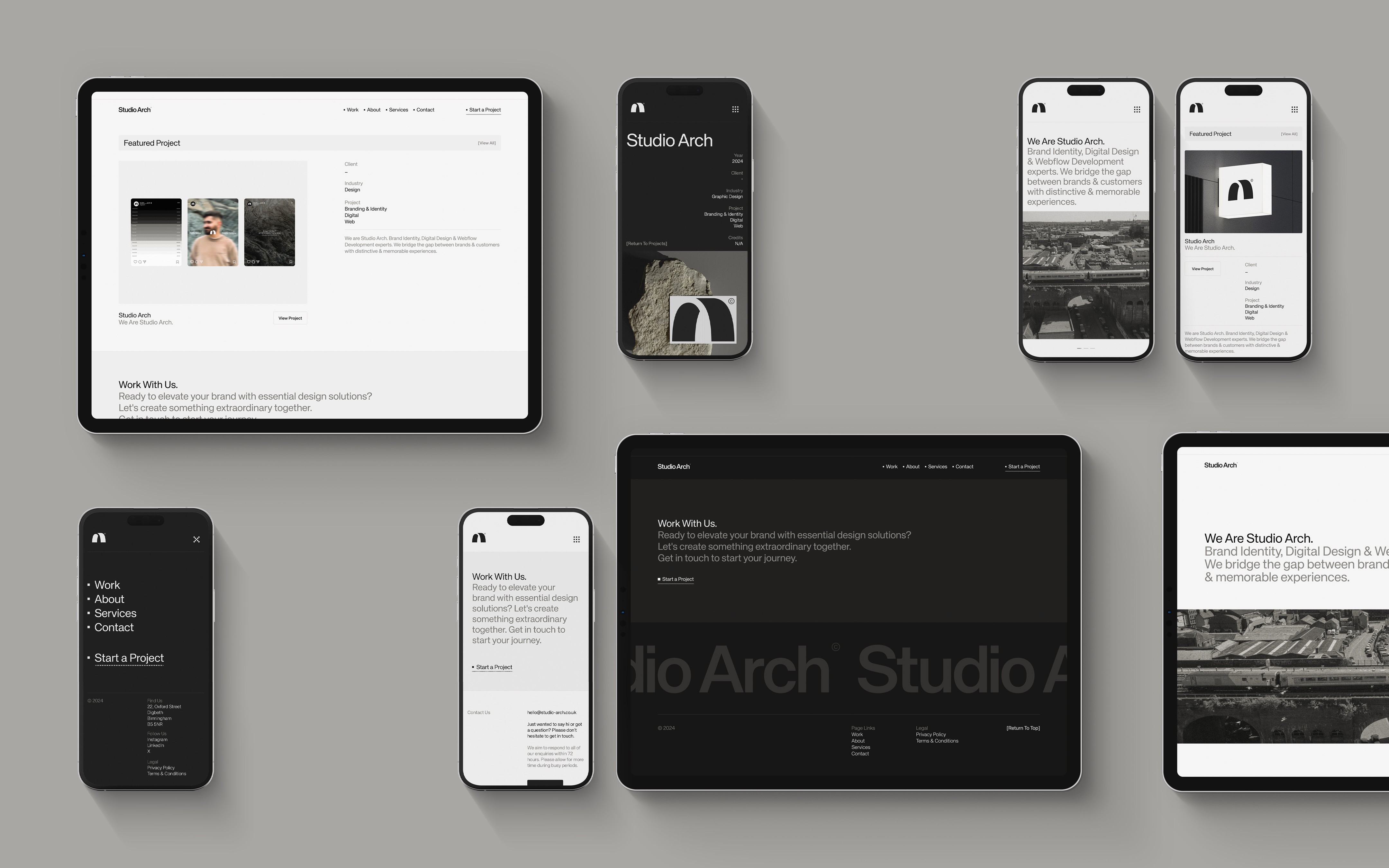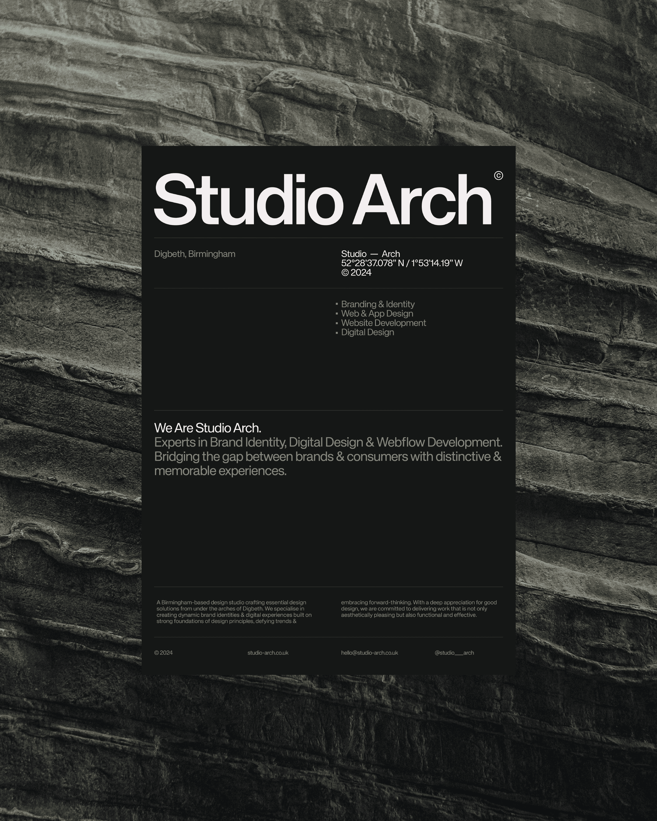 Paying homage to the iconic railway arches of Digbeth, where our studio is proudly located—a district steeped in rich history & brimming with future potential. From our name & logo to our colour palette, every element is designed to reflect the industrial charm of Digbeth. Embracing hues of black, white, and greys, our aesthetic echoes the raw & urban essence of our vibrant surroundings. Studio Arch is not just a name; it embodies our connection to Digbeth's architectural heritage & creative energy.